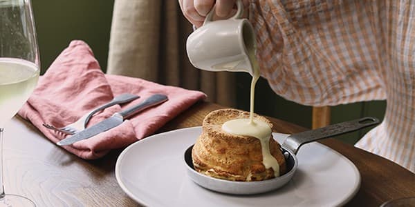 Our twice-baked cheese soufflé is an iconic dish here at The Barley Mow – light, airy, and so utterly delicious.